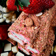 В состав входят: cukurs, гликозовые сиропы, kukurūzas ciete, zemeņu sula, baltas šokolades krēms, mandeles, lazdu rieksti, dabīgs aromāts, dabīgas pārtikas krāsvielas.