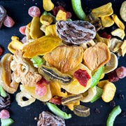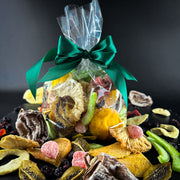 Šis dāvanu komplekts ir īsts augļu cienītāju sapnis – harmoniska dažādu žāvētu augļu kolekcija, kur katrs gabaliņš stāsta savu unikālo garšu stāstu. Komplektā ietilpst: sulīgā hurma – gan veselos augļos, gan šķēlītēs, košais kumkvats ar maigu saldskābu noti, dzērvenes, tropu mango un dzeltenā melone ar cukuru, kā arī aromātiskā papaija, atsvaidzinošais pomelo, dabīgi saldais ananass bez cukura, maigie āboli bez cukura un eksotiskais ananass ar vieglu saldumu.