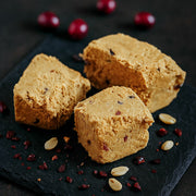 Neparasta, bet ļoti garšīga zemesriekstu halvas un žāvētu dzērveņu kombinācija. Dzērveņu vieglais skābums mīkstina halvas saldumu. Katrs kumoss ir gardēža prieks! Visiem dzērveņu cienītājiem tas patiks!